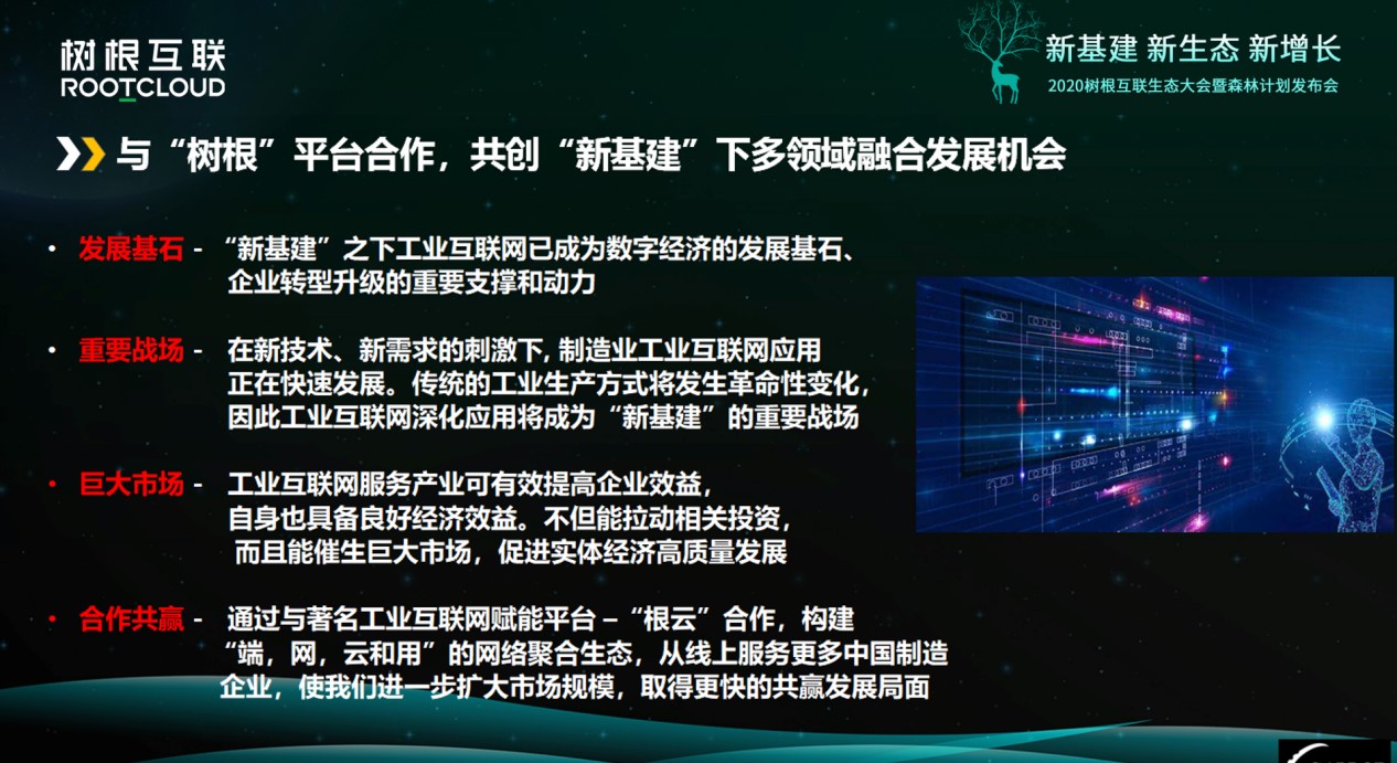 在蔣凱文看來,攜手樹根科技共建工業(yè)互聯(lián)網(wǎng)生態(tài),尤其是在最近強調(diào)的“新基建”情況下,可以在多個領(lǐng)域得到融合發(fā)展機會。工業(yè)互聯(lián)網(wǎng)之下,整個工業(yè)深化應(yīng)用將成為“新基建”重要戰(zhàn)場,給社會效益、企業(yè)效益、經(jīng)濟效益都帶來高質(zhì)量發(fā)展動能。“所以合作共贏是一個最好的結(jié)果,我們通過與‘根云’的合作,構(gòu)建了‘根、網(wǎng)、云、用’的網(wǎng)絡(luò)聚合生態(tài),必將擁有巨大市場發(fā)展空間。”