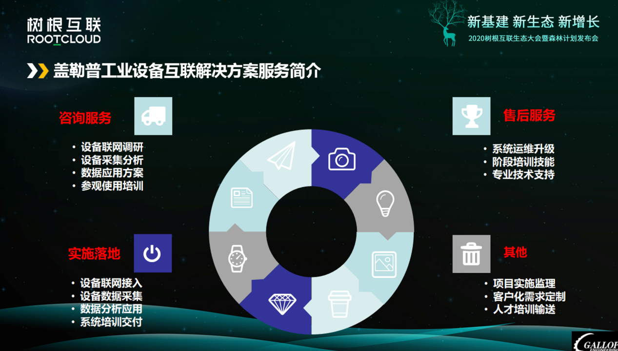 蓋勒普的專業(yè)服務(wù),涉及到從項目解決方案、技術(shù)的咨詢服務(wù)、項目實施的落地服務(wù)和售后專業(yè)咨詢的培訓(xùn),包括項目實施的跟進、客戶專業(yè)化的定制和開發(fā)、人才技術(shù)培訓(xùn),售后技術(shù)升級等一個廣泛的綜合服務(wù)。其工業(yè)設(shè)備聯(lián)網(wǎng)解決方案價值體現(xiàn)在,提供設(shè)備網(wǎng)絡(luò)化、設(shè)備管理平臺化、用數(shù)據(jù)支撐企業(yè)提高設(shè)備綜合效率、服務(wù)精益管理(關(guān)鍵目標)、輔助企業(yè)管理快速決策。
