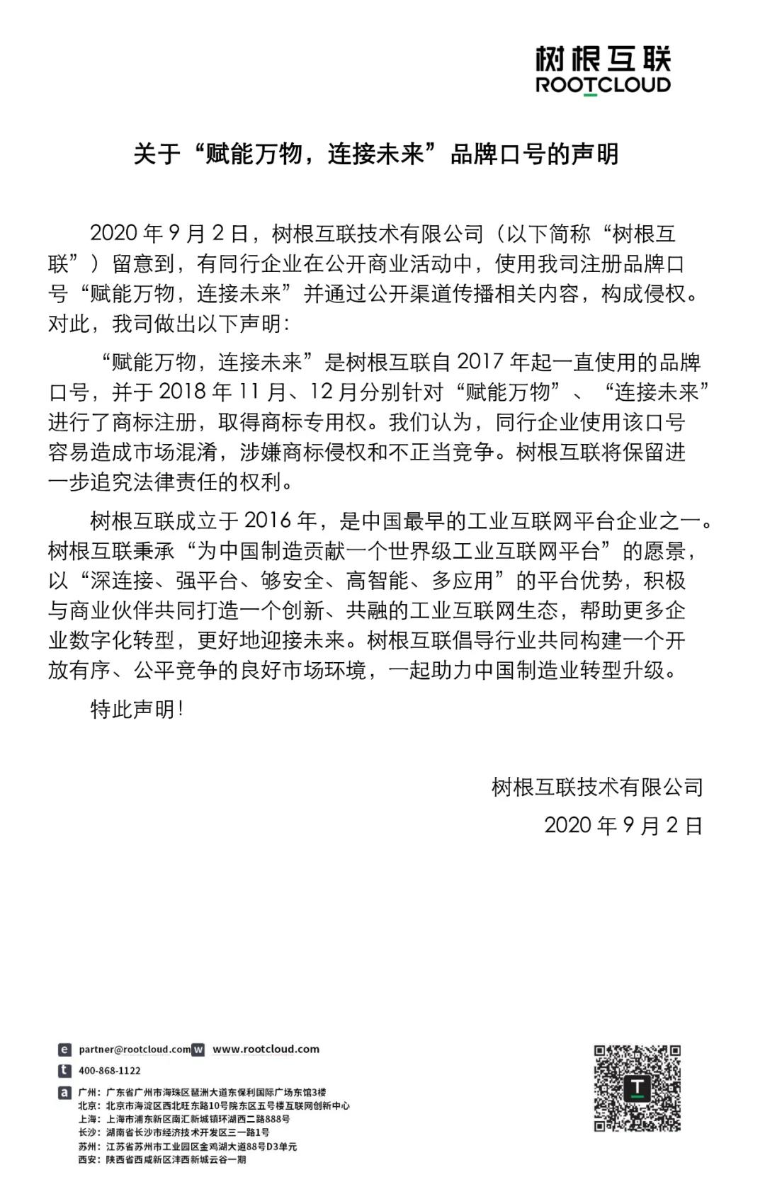 近日,樹根科技技術有限公司(以下簡稱“樹根科技”)留意到,有同行企業在公開商業活動中,使用我司注冊品牌口號“賦能萬物,連接未來”并通過公開渠道傳播相關內容,構成侵權。對此,我司做出以下聲明——