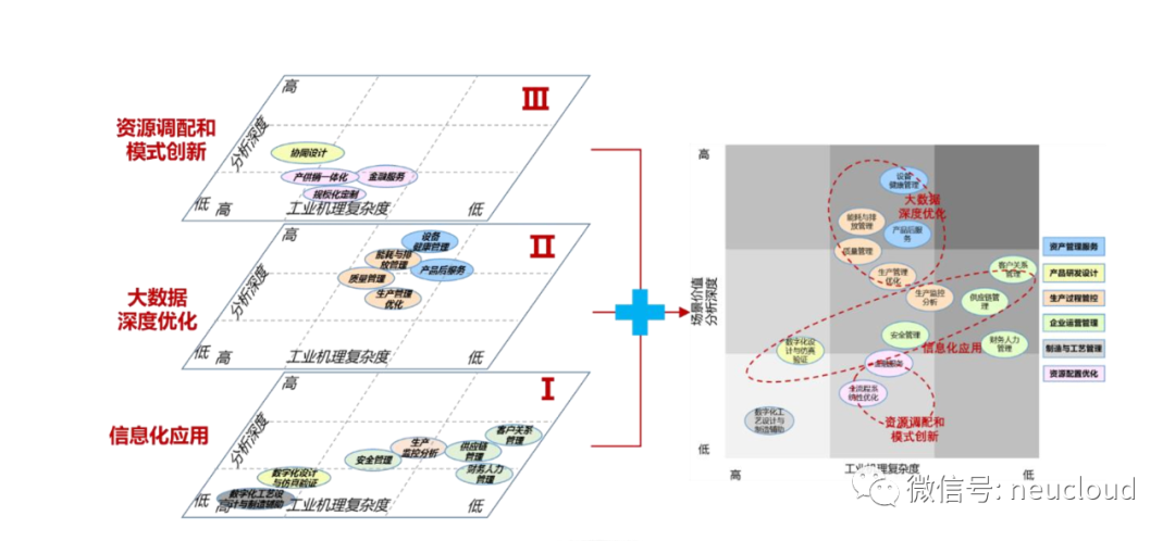 總結(jié)來(lái)看,工業(yè)互聯(lián)網(wǎng)平臺(tái)應(yīng)用實(shí)現(xiàn)了從信息化到網(wǎng)絡(luò)化、智能化的全覆蓋,并且由單點(diǎn)信息化走向跨域智能化,呈現(xiàn)出三大發(fā)展層次: