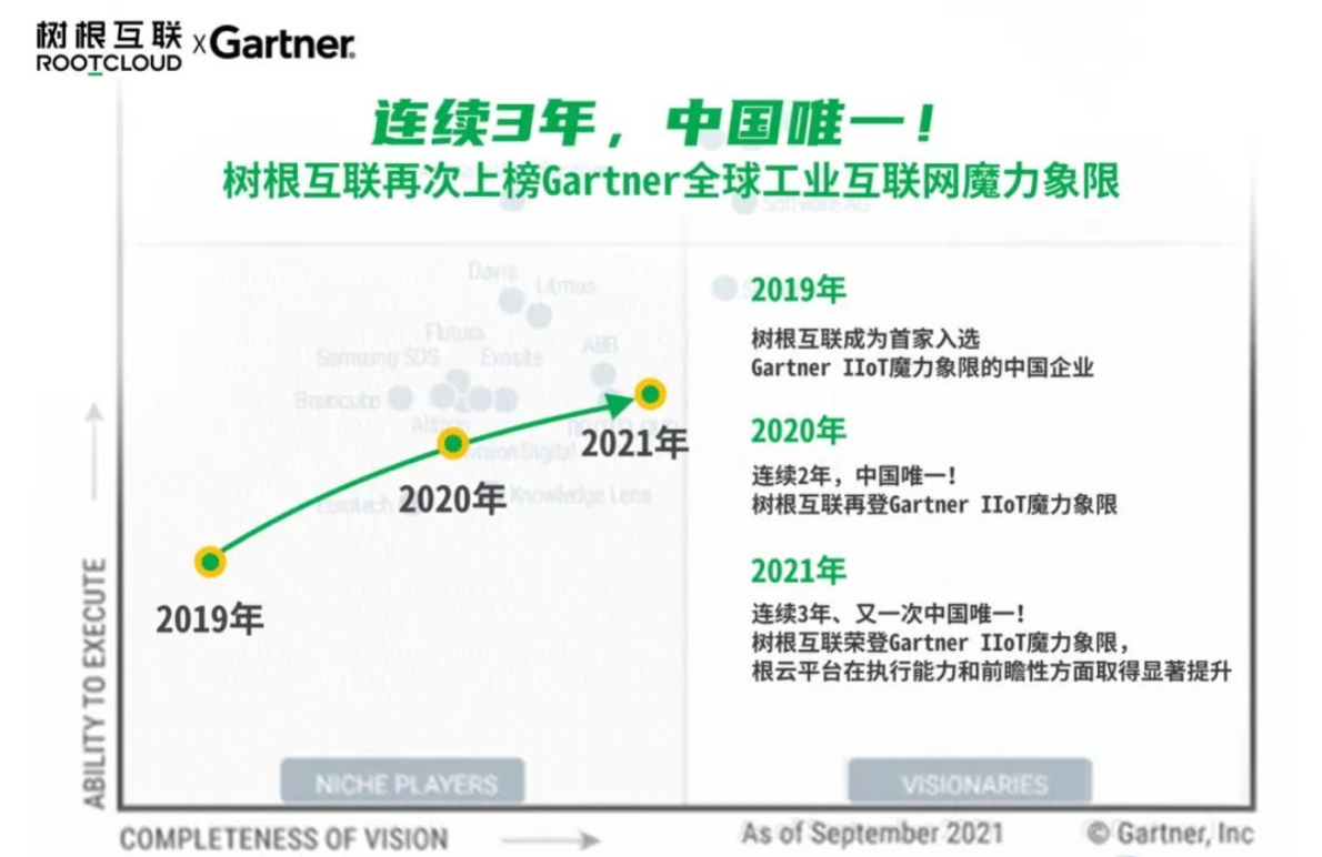 自2016年成立至今,短短5年內(nèi),樹根科技股份有限公司(以下簡(jiǎn)稱“樹根科技”)發(fā)展迅猛。2016年12月,樹根科技發(fā)布1.0版本的工業(yè)互聯(lián)網(wǎng)平臺(tái)——ROOTCLOUD(根云);2018年,樹根科技落戶廣州;2019年至2021年,樹根科技連續(xù)3年入選國(guó)際咨詢公司Gartner《全球工業(yè)互聯(lián)網(wǎng)平臺(tái)魔力象限報(bào)告》,是目前唯一一家入選的中國(guó)工業(yè)互聯(lián)網(wǎng)平臺(tái)公司,2019年至2020年,根云連續(xù)兩年入選工信部的跨行業(yè)跨領(lǐng)域工業(yè)互聯(lián)網(wǎng)平臺(tái)(以下簡(jiǎn)稱“雙跨平臺(tái)”),是目前全國(guó)15大雙跨平臺(tái)之一;2020年12月,樹根科技完成C輪8.6億元的融資,估值超11億美元,成為中國(guó)工業(yè)互聯(lián)網(wǎng)獨(dú)角獸企業(yè)。