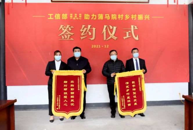 在蒲馬院村村委會舉行的工信部助力蒲馬院村鄉村振興簽約儀式上,工信部機關服務局相關負責人與蒲馬院村相關負責人共同簽訂了扶貧采購協議,蒲馬院村代表向工信部代表敬獻了錦旗:“數字轉型促發展,情系鄉村顯擔當“。