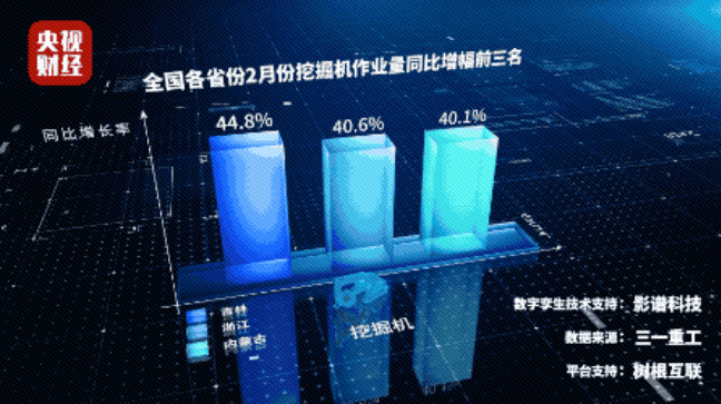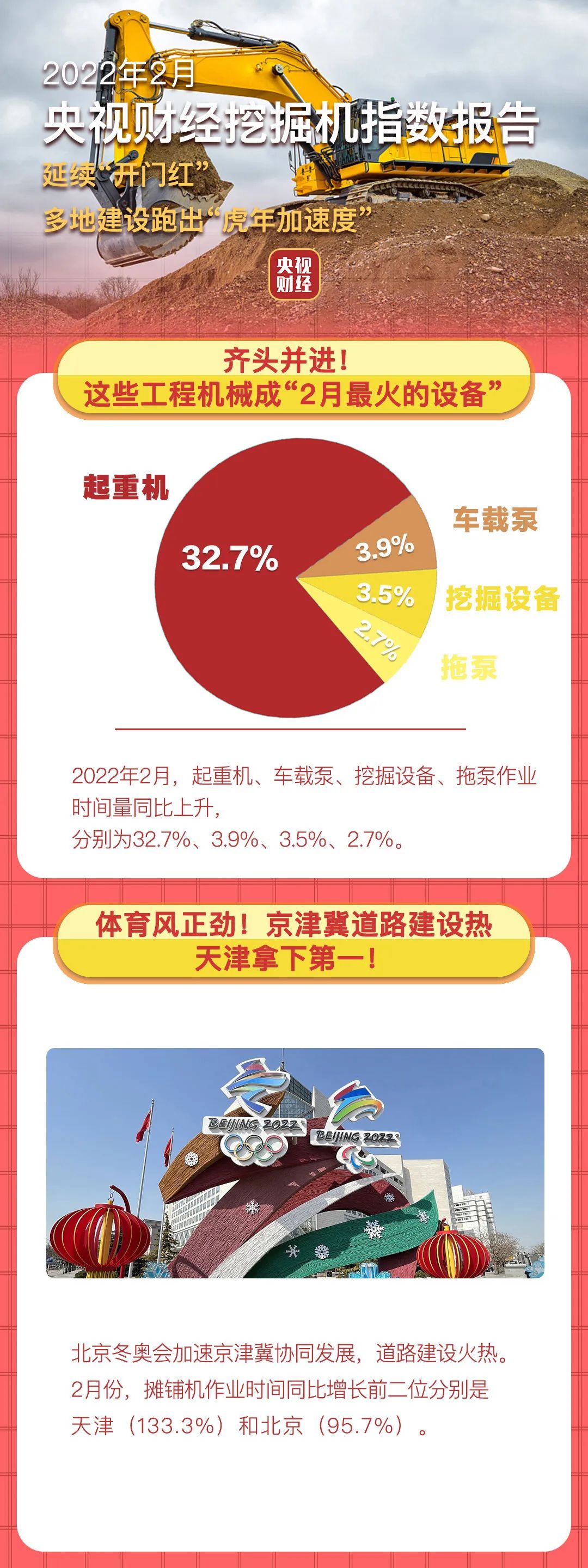 央視財經(jīng)與三一重工、樹根科技聯(lián)合打造的“央視財經(jīng)挖掘機指數(shù)”今天發(fā)布了最新相關(guān)數(shù)據(jù)。2月份,雖然受虎年春節(jié)假期影響,但是我國各類工程機械作業(yè)量穩(wěn)步增長,多省份工程建設(shè)更是跑出了“虎年加速度”。