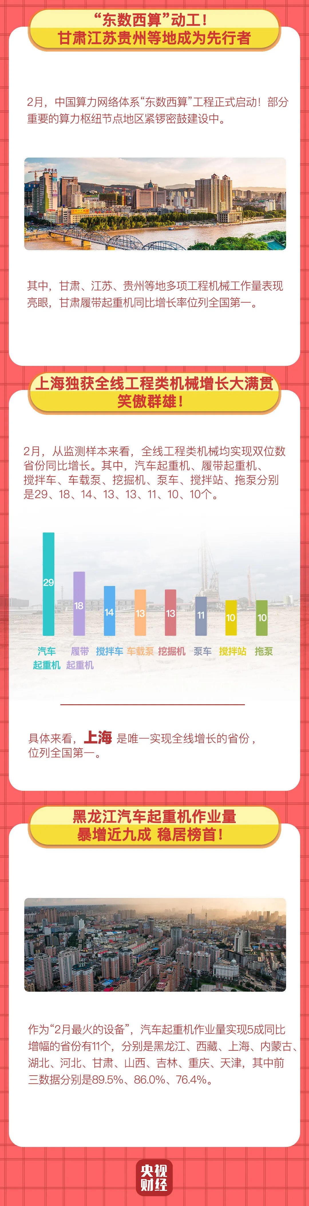央視財經(jīng)挖掘機指數(shù)顯示,2月份,甘肅、江蘇、貴州多項工程機械作業(yè)量實現(xiàn)同比增長,其中甘肅多項工程機械作業(yè)量表現(xiàn)亮眼,履帶起重機同比增長率位列全國第一。