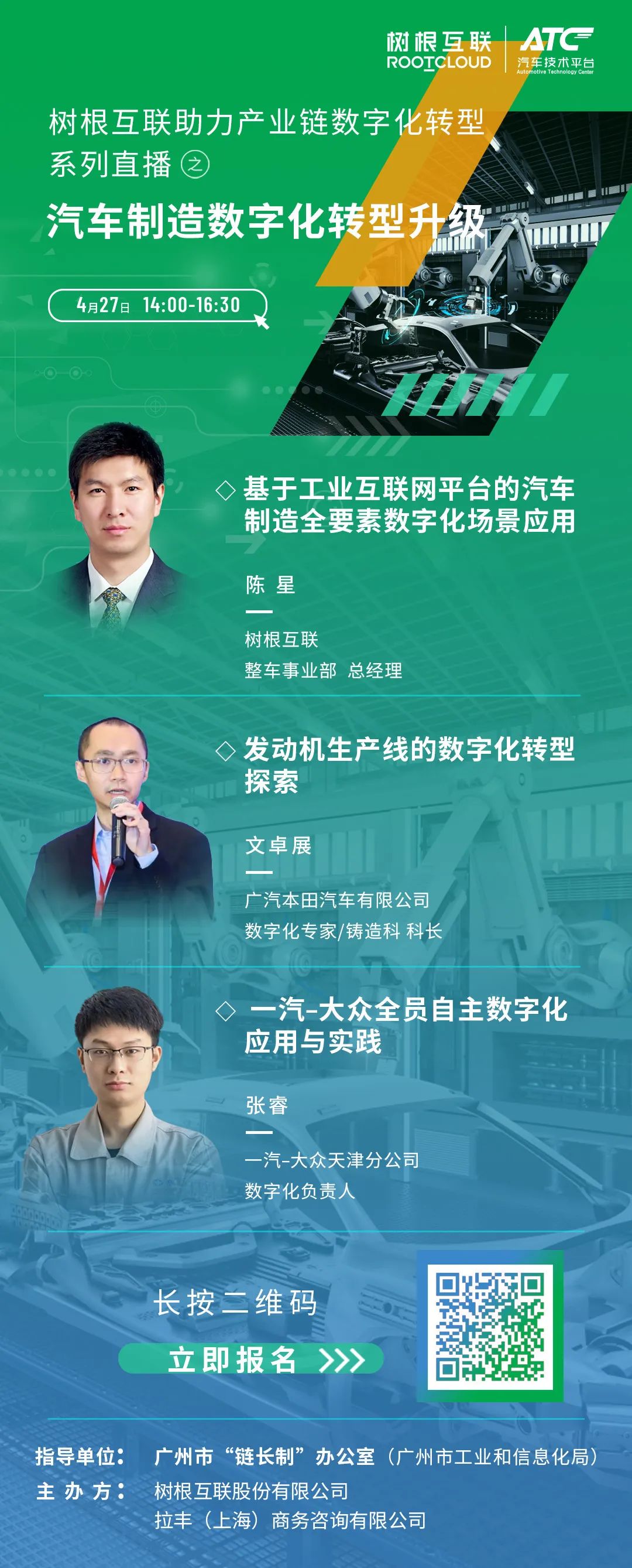 2022年4月27日,在廣州市“鏈長制”辦公室(廣州市工業和信息化局)的指導下,樹根科技作為廣州市“軟件和信創”產業鏈“鏈主”企業,聯合ATC汽車技術平臺舉辦樹根科技助力產業鏈數字化轉型之“汽車制造數字化轉型升級”系列直播活動。特邀廣汽本田、一汽-大眾數字化專家們,線上為聽眾帶來汽車制造數字化專業分享。歡迎各位關注并參與此次線上研討會!
