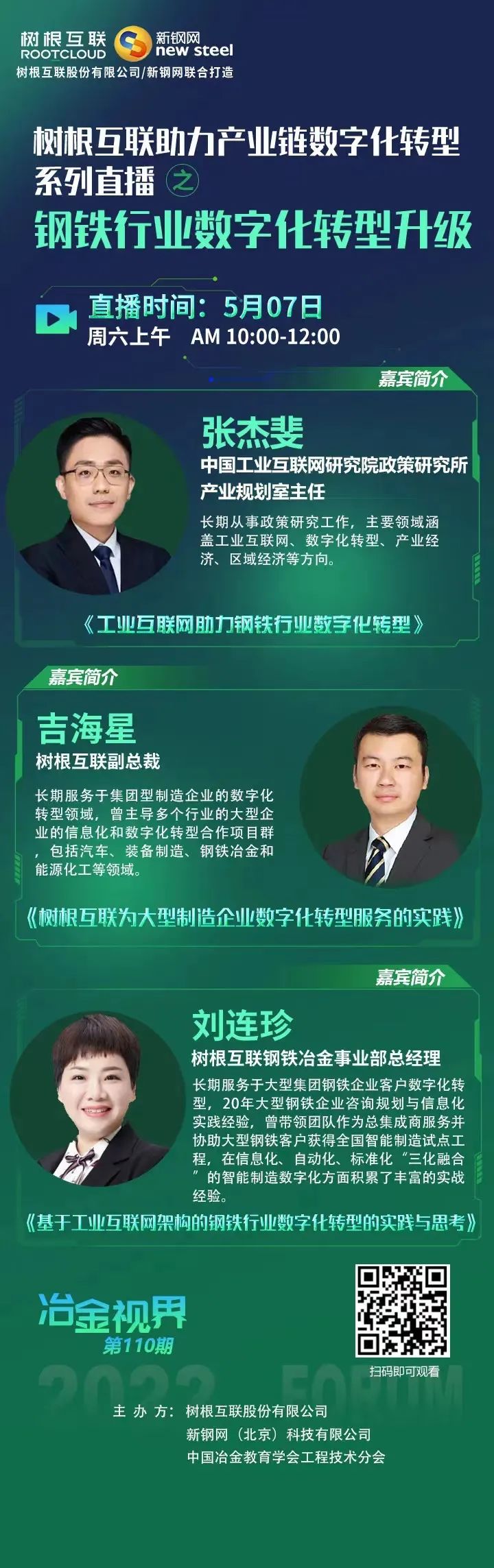 2022年5月7日,在廣州市“鏈長制”辦公室(廣州市工業(yè)和信息化局)的指導下,樹根科技作為廣州市“軟件和信創(chuàng)”產(chǎn)業(yè)鏈“鏈主”企業(yè),聯(lián)合新鋼網(wǎng)舉辦樹根科技助力產(chǎn)業(yè)鏈數(shù)字化轉(zhuǎn)型系列直播之“鋼鐵行業(yè)數(shù)字化轉(zhuǎn)型升級”活動,特邀數(shù)字化轉(zhuǎn)型專家們帶來鋼鐵行業(yè)的專業(yè)分享,歡迎各位關注參與本次線上直播活動。