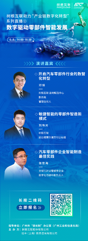2022年6月8日,在廣州市“鏈長(zhǎng)制”辦公室(廣州市工業(yè)和信息化局)的指導(dǎo)下,樹(shù)根科技聯(lián)合ATC汽車(chē)技術(shù)平臺(tái),舉辦樹(shù)根科技助力產(chǎn)業(yè)鏈數(shù)字化轉(zhuǎn)型系列直播之“數(shù)字驅(qū)動(dòng)零部件智能發(fā)展”活動(dòng)。特邀樹(shù)根科技、全球TOP10零部件企業(yè)數(shù)字化專家,線上為聽(tīng)眾帶來(lái)汽車(chē)零部件企業(yè)的數(shù)字化轉(zhuǎn)型分享。