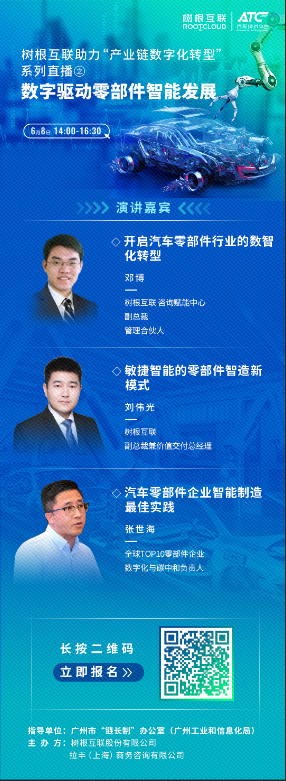 202268,在廣州市鏈長制辦公室(廣州市工業和信息化局)的指導下,樹根科技聯合ATC汽車技術平臺,舉辦樹根科技助力產業鏈數字化轉型系列直播之數字驅動零部件智能發展活動。特邀樹根科技、全球TOP10零部件企業數字化專家,線上為聽眾帶來汽車零部件企業的數字化轉型分享。