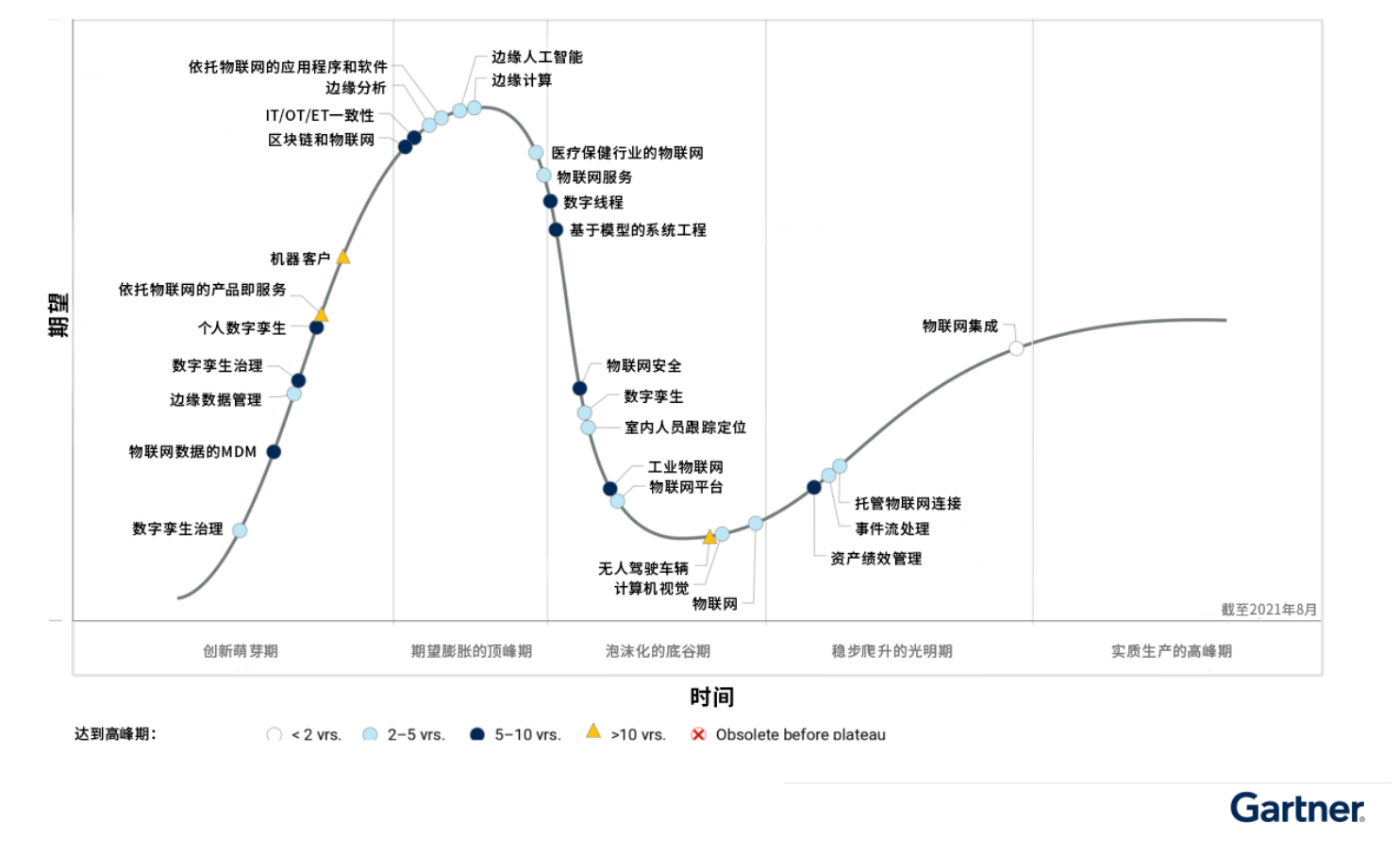 《白皮書》首次披露《Gartner2021年物聯(lián)網(wǎng)技術(shù)成熟度曲線》,幫助裝備制造企業(yè)從第三方視角客觀評估物聯(lián)網(wǎng)關(guān)鍵技術(shù)的成熟度水平以輔助決策。