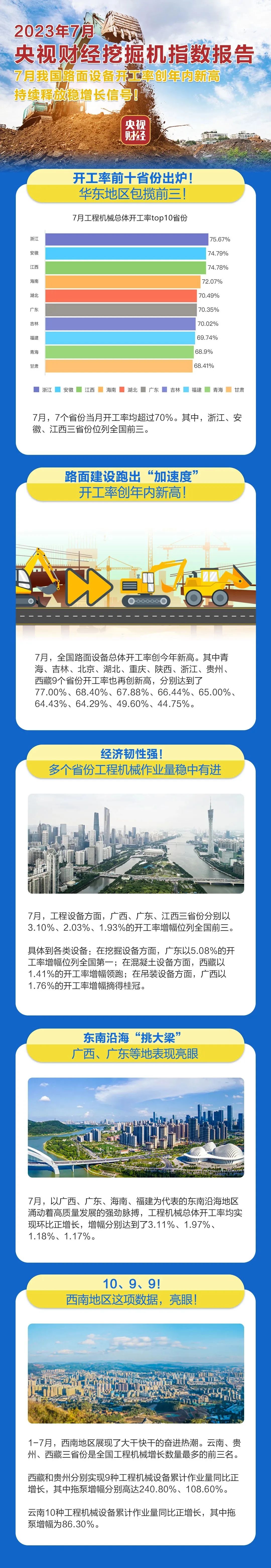 7月,以廣西、廣東、海南、福建為代表的東南沿海地區涌動著高質量發展的強勁脈搏,工程機械總體開工率均實現環比正增長,增幅分別達到3.11%、1.97%、1.18%、1.17%。