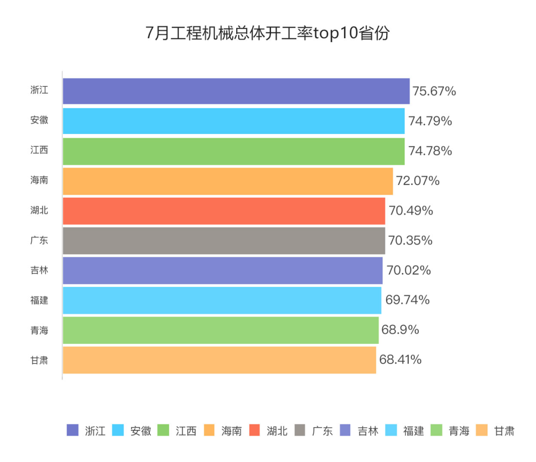 7月,7個省份當月開工率均超過70%。其中,浙江、安徽、江西三省份位列全國前三。