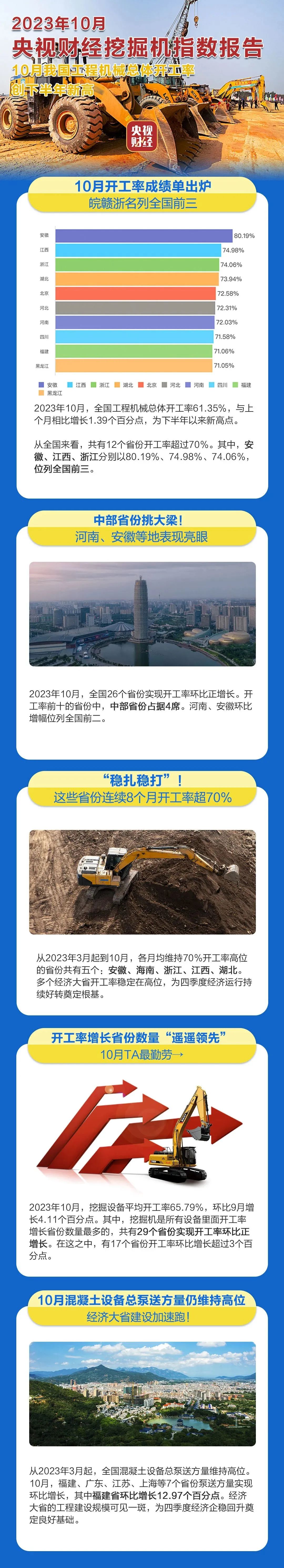 挖掘機是基礎(chǔ)設(shè)施建設(shè)的“標(biāo)配”,是反映基礎(chǔ)設(shè)施建設(shè)、觀察固定資產(chǎn)投資等經(jīng)濟變化的風(fēng)向標(biāo)。央視財經(jīng)與三一重工、樹根科技聯(lián)合打造的“央視財經(jīng)挖掘機指數(shù)”日前發(fā)布了最新相關(guān)數(shù)據(jù)。10月我國工程機械總體開工率61.35%,創(chuàng)下半年新高。我國各項基礎(chǔ)設(shè)施建設(shè)加速,多組數(shù)據(jù)展現(xiàn)中國經(jīng)濟澎湃動能,高質(zhì)量發(fā)展穩(wěn)步推進。