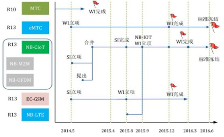 3GPP標準組織為應對LoRa、Sigfox、Ingenu 等非授權頻段 LPWA 技術挑戰, 迅速明確了 NB-IoT、eMTC 及 EC-GSM 三條清晰的 LPWA 技術發展路線。但許多運營商存在頻譜重耕的預期,而且不少運營商在 2G 時代根本沒有部署 GSM 網絡,實質上的主流技術也就 eMTC 和 NB-IOT。當前,NB-IOT 和 eMTC 標準化已完成,如下圖所示。