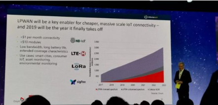 在今天的大會上,Bell 認為LPWAN將是更廉價更巨大IoT 爆發的關鍵,2019年這個市場一定會起飛,今年每月連接費用降低到1美元以下,模塊成本降低到10美元以下(這個顯然還有點保守)。