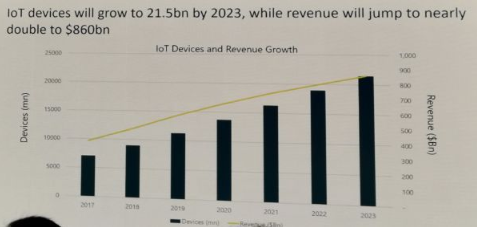 在主題演講之前,分析咨詢機構Ovum IoT Practice負責人Alexandra Rehak與咨詢公司Heavy Reading IoT高級分析師Steve Bell共同分享了 IoT研究的一些數據, 據公布的預測數據,到2023年,全球聯網的IoT設備會達到230億,同時IoT的營收會躍升到8600億美元!增速驚人!