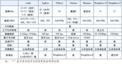 各種LPWAN 技術指標對比