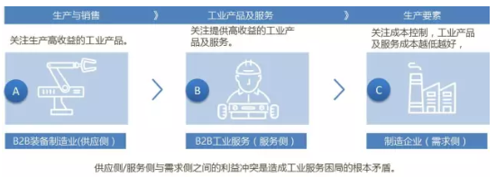 而在制造業去產能、調結構的背景下,工業趨于中低速增長,B2B工業服務供需雙方呈現結構性失衡。這些利益沖突,將以制造業向更高效、更經濟、更安全的營運訴求,倒逼B2B工業服務與B2B裝備制造業實施變革。