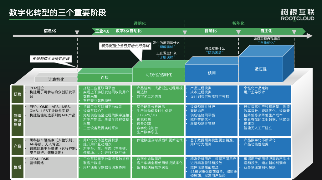秉承著“以業務價值為目的進行設備連接”的準則,樹根科技深挖數據價值,在轉型各個階段向下深入汽車行業每個流程環節,從研發到售后服務,為企業指明了轉型路徑,并充分釋放數據價值,探索每個階段數據應用的可能性,為企業全面數字化提供有力支撐。