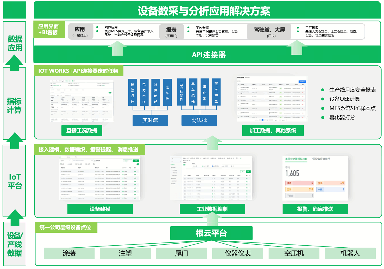 提供設(shè)備數(shù)采、數(shù)據(jù)建模、數(shù)據(jù)分析(包括設(shè)備OEE、工時(shí)優(yōu)化、工藝執(zhí)行監(jiān)控、輔料消耗優(yōu)化)等功能